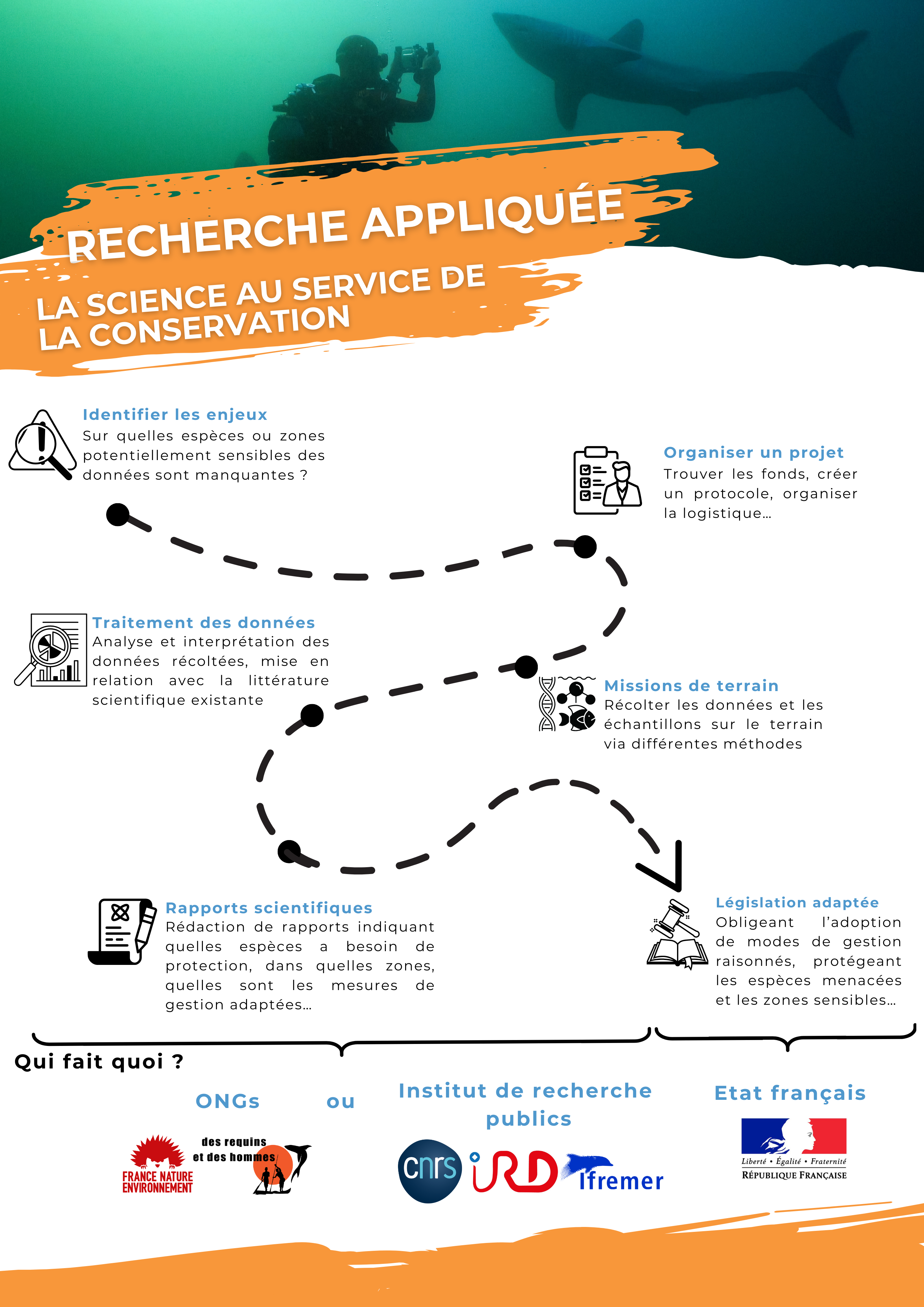 En partenariat avec d’autres ONG, des universités et des laboratoires locaux, nous mènerons des projets de recherche scientifique sur les espèces présentes dans les zones d’intérêt pour l’étude et la conservation des requins afin de mieux comprendre leur biologie et leur exploitation. L’utilisation de méthodologies non invasives (ADN environnemental, acoustique, prélèvement physico-chimiques, photo-identification, observation in-situ, études des débarquements etc..) sera privilégié afin de mener des projets qui se veulent éthiques et respectueux de la biodiversité marine. L’objectif est d’améliorer les connaissances sur ces espèces et de les mettre à disposition de la communauté scientifique internationale, afin de les protéger plus efficacement. Nous participerons également à d’autres projets scientifiques nécessitant une collecte de données sur les points stratégiques visités, en proposant un service d’échantillonnage sous voile, donc sans émission de carbone.